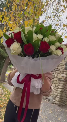 Flowers is a classic expression of love and sweet affection! Our splendid bouquet of stem and bush roses arrives accented with lush greens, all beautifully arranged by designers. You will have her at first blush when she sees this stunning bouquet. We've gathered a lush mix of fresh stem red roses and white stem roses and shrub blooms in cream colors a harmonious combination for everyday elegance. Its a heartfelt gift for birthdays, anniversaries or just to flatter a splendid rose of your heart.