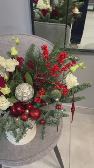 Christmas is high time to surprise and express feelings. Christmassy Love Arrangement is a perfect gift for someone special. This artful arrangement of red gerbera and cream roses accented by pinecones and spruce is set in a seasonal present box. This is a stunning gift that they will never forget!
